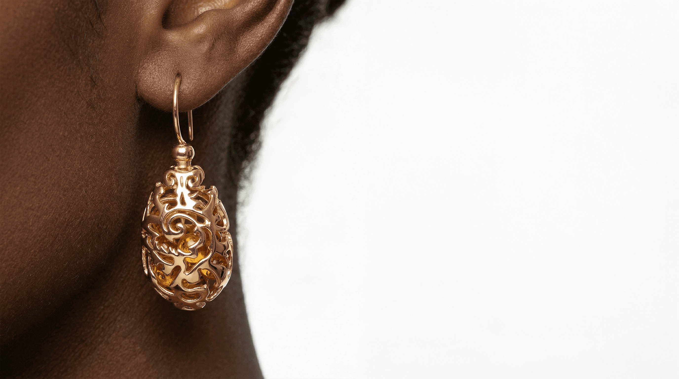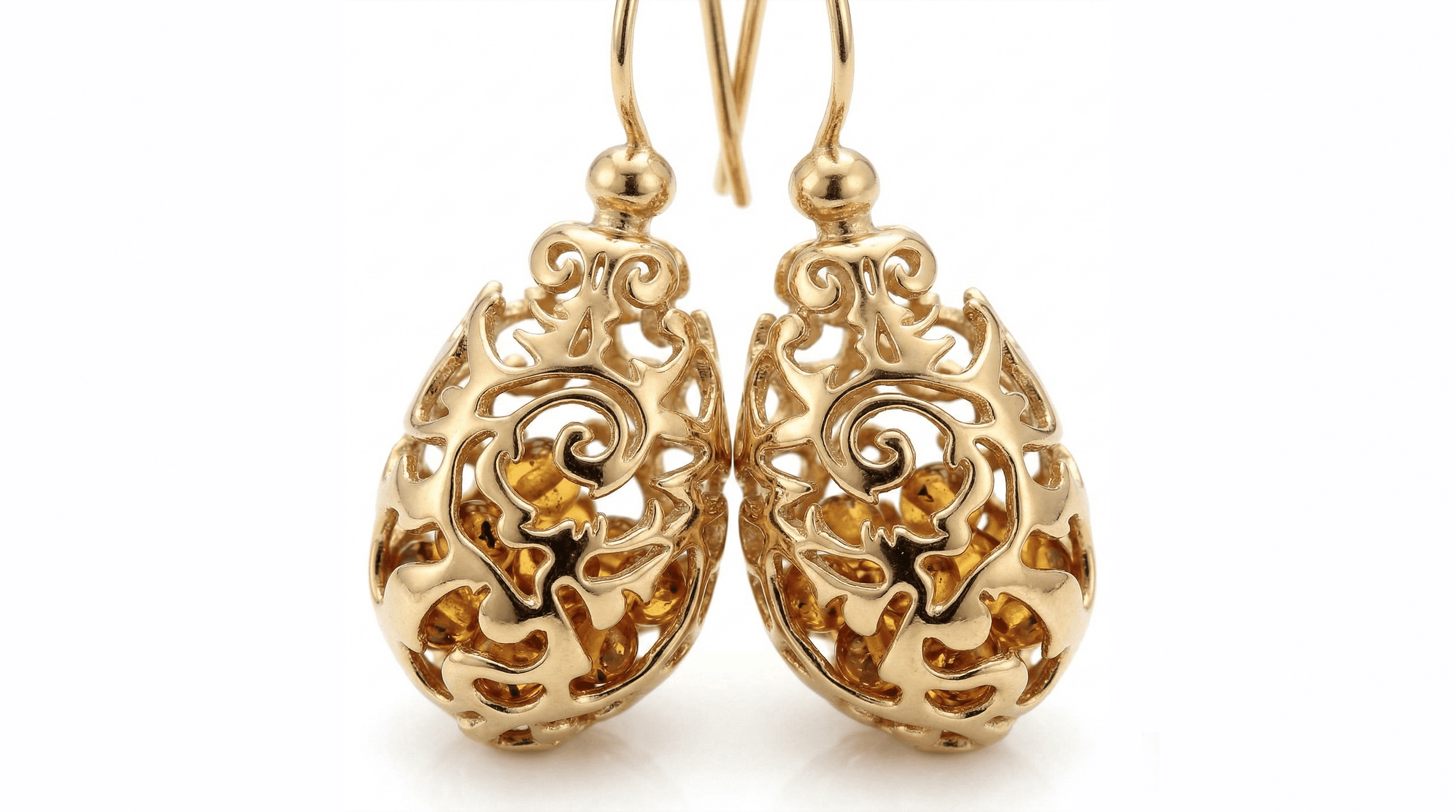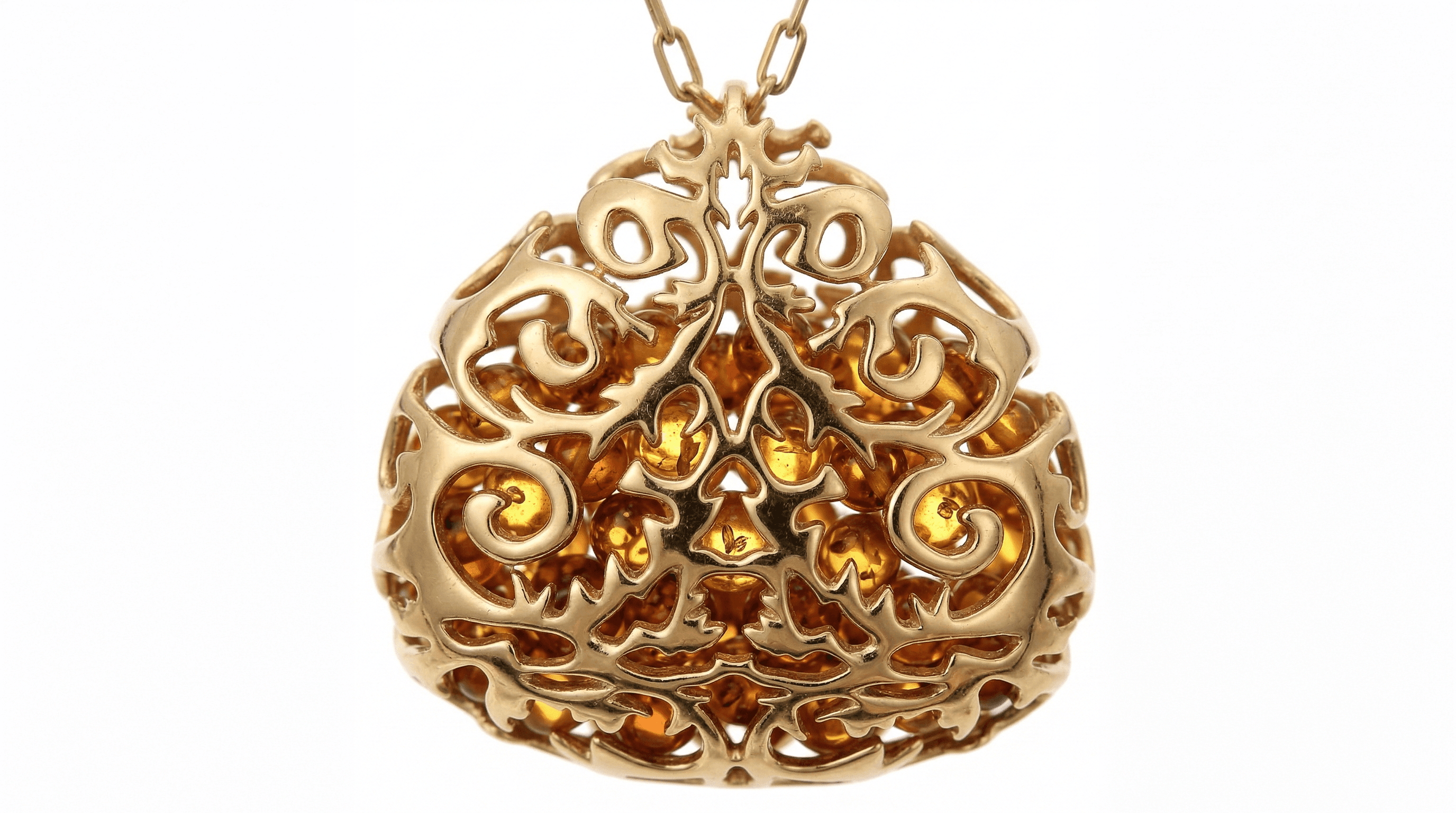 Połączenie klasycznej rzeźbiarskiej formy i nowoczesnej inżynierii druku 3D, w której złote liście misternie otulają swobodnie tańczące kuleczki bałtyckiego bursztynu.