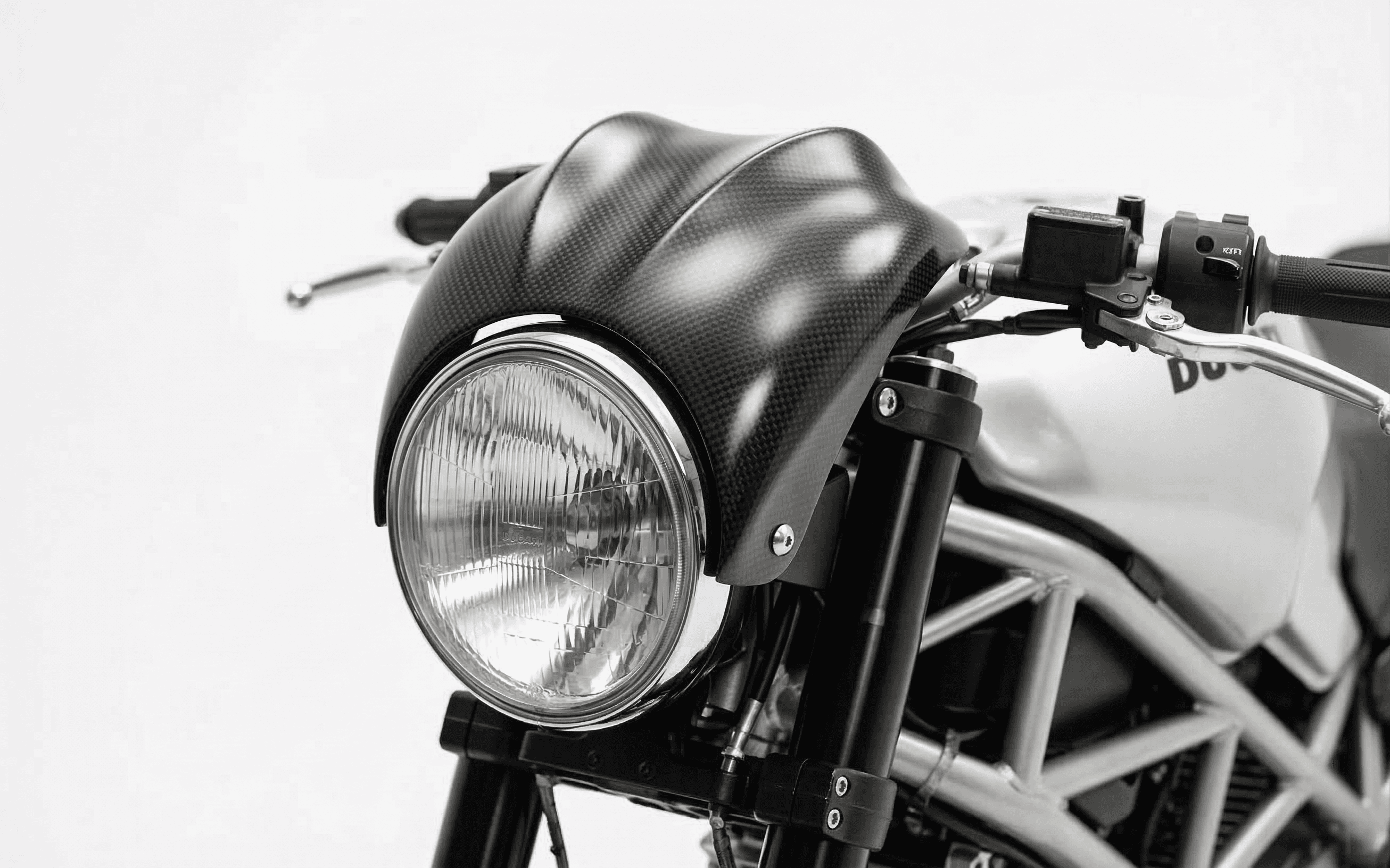 Precyzyjnie wyprofilowana owiewka z włókna węglowego płynnie integrująca się z frontem motocykla, podkreślając jego surową charakterystykę i drapieżną linię stylistyczną.