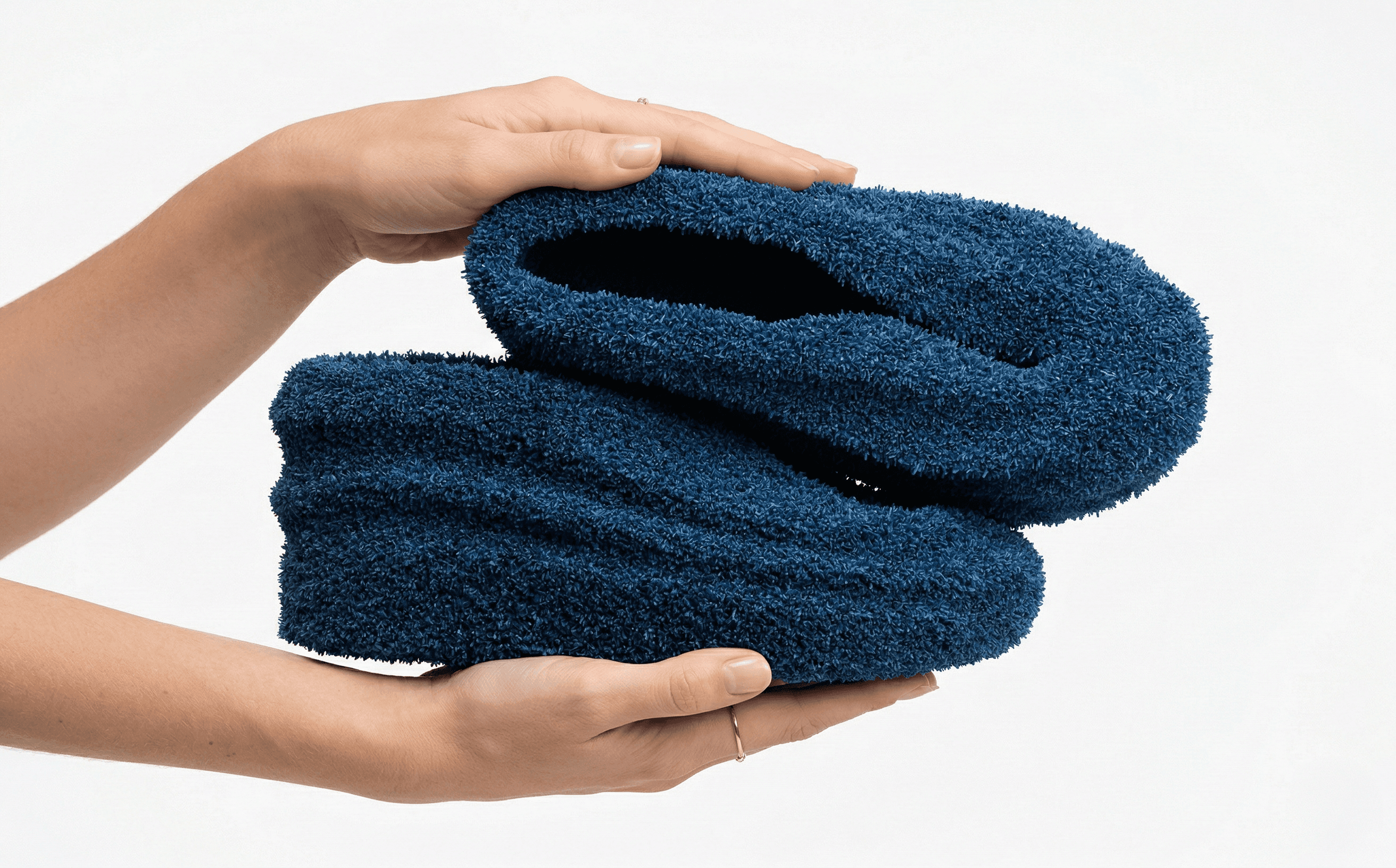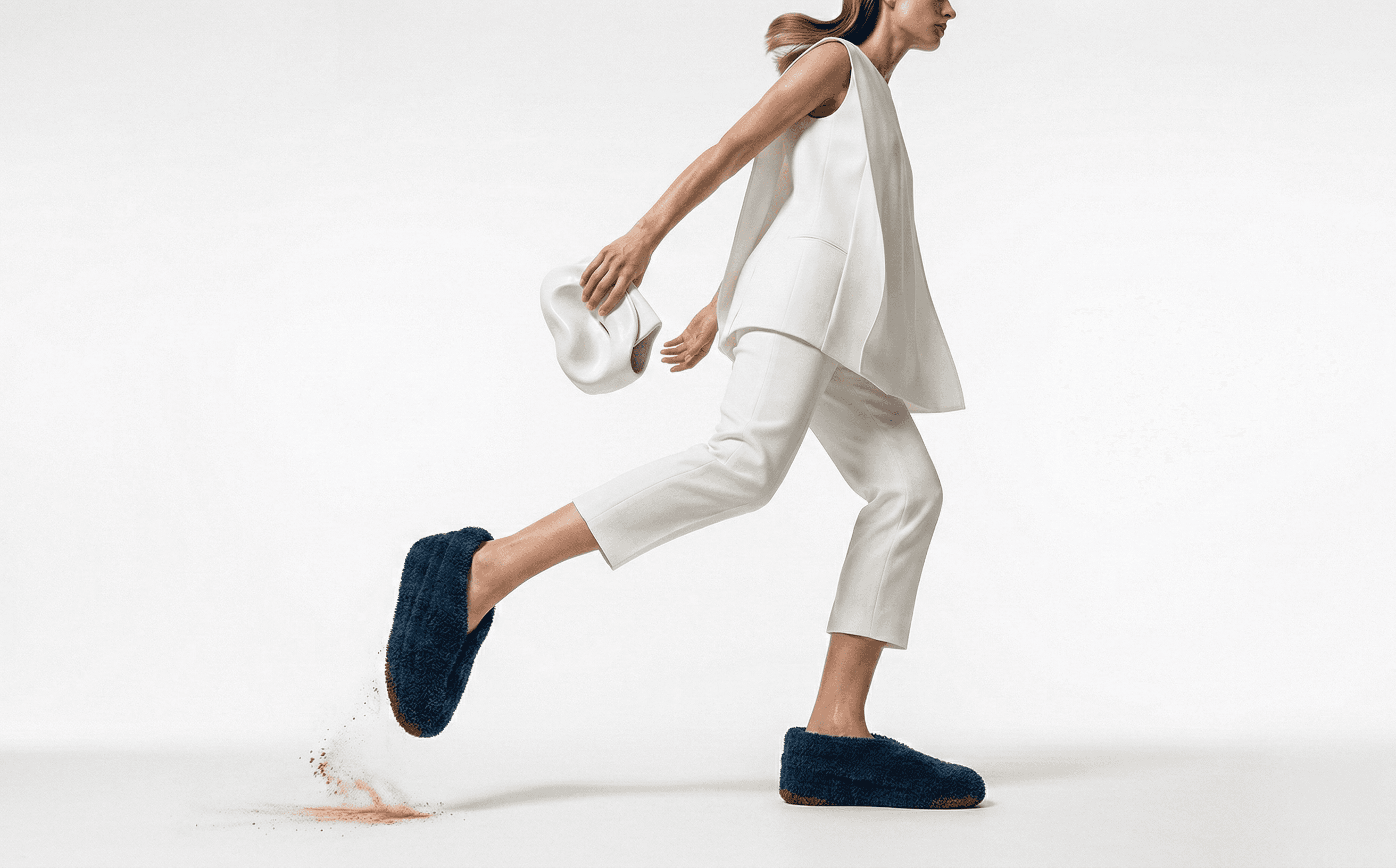 Odpowiedzią na to wyzwanie stało się stworzenie bezkompromisowego konceptu obuwia hybrydowego, które niweluje ten podział, wprowadzając radykalną, hiper-haptyczną (skupioną na dotyku) teksturę do przestrzeni publicznej i mody high fashion. Zaprojektowano buty o minimalistycznej, wsuwanej bryle, w całości pokryte jednorodnym, niezwykle puszystym materiałem, co stanowi awangardowy manifest komfortu i zmysłowej stymulacji, stojący w wyraźnej opozycji do technicznych, gładkich powierzchni współczesnego streetwearu.
