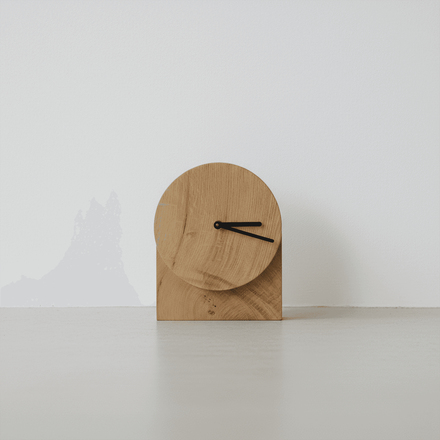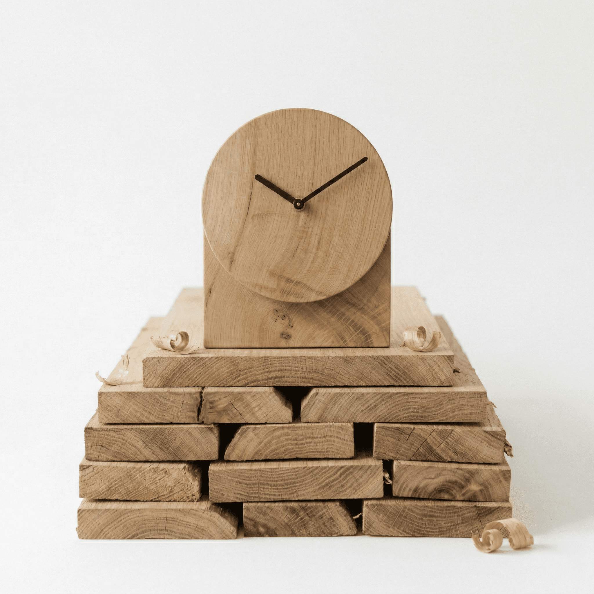 Odpowiedzią jest stworzenie w pełni monolitycznej bryły z litego dębu, gdzie jedynym dowodem upływającego czasu są dwie proste wskazówki na zupełnie czystym tle. Zamiast dodawać elementy, projekt opiera się na odejmowaniu i pracy z samą geometrią. Aby nadać zegarowi unikalny wyraz, wprowadzono dwa kluczowe, powściągliwe zabiegi przestrzenne: wysunięcie tarczy względem płaskiego tła, co naturalnie formuje stabilną podstawę, oraz delikatne pochylenie samego cyferblatu. To pochylenie dba o ergonomię. Czas jest czytelny niezależnie od kąta patrzenia, a wysunięta tarcza tworzy grę światłocienia, która ożywia bryłę. Dzięki temu zegar nie jest banalny; staje się rzeźbiarskim, ponadczasowym obiektem, w którym to unikalny rysunek dębu i czysta funkcja grają jedyną rolę.